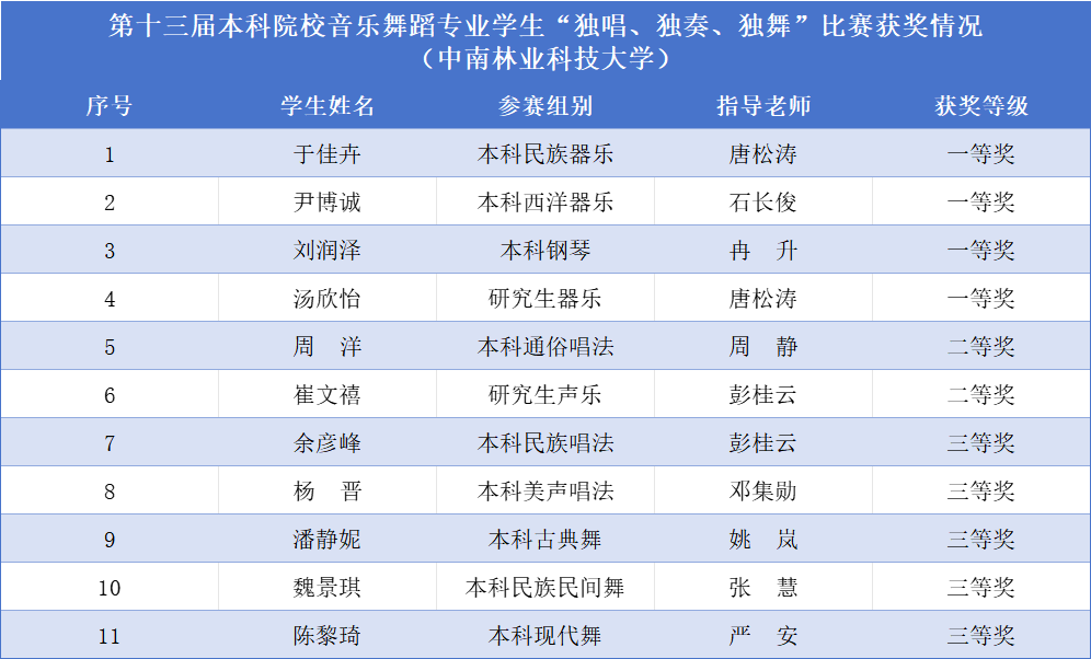 【林大网讯】(文/体育与音乐学院)近日,由湖南省教育厅主办的湖南省第十三届本科院校音乐舞蹈专业学生“独唱、独奏、独舞”比赛圆满落幕。我校学子凭借出色的专业素养和舞台表现在比赛中表现脱颖而出,斩获一等奖4项、二等奖2项、三等奖5项。