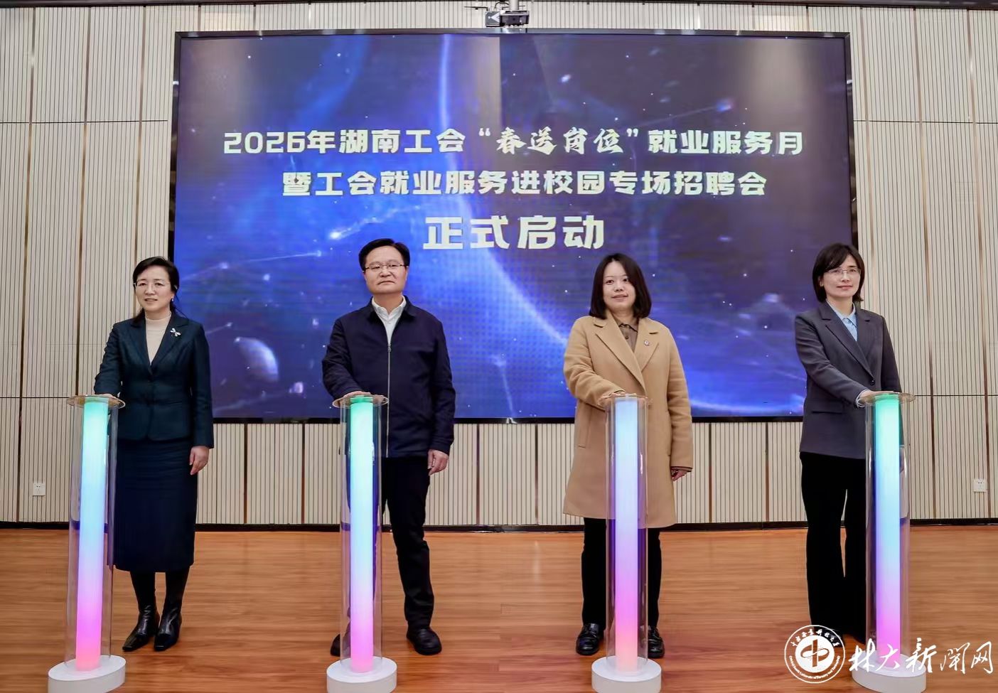【林大网讯】3月13日,湖南工会就业服务进校园专场招聘会在我校体育艺术馆举行,并同步启动2026年湖南工会“春送岗位”就业服务月。活动由省总工会、省人力资源和社会保障厅主办,省教育工会、中南林业科技大学承办,长沙市总工会、株洲市总工会、湘潭市总工会、省直机关工会、省直属基层工会工作委员会协办。省总工会副主席李博,全国劳动模范、大国工匠、中车首席技能专家,省总工会兼职副主席易冉,省教育工会主席邓曼,我校校长仇怡、副校长刘高强出席活动。