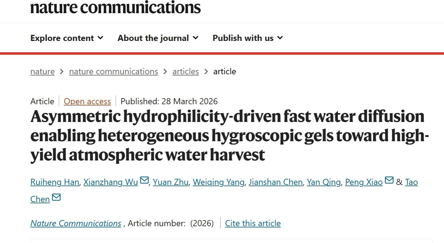 【林大网讯】(文/材料与能源学院)近日,我校吴献章副教授在生物基材料与水分作用机制研究领域取得重要突破。该研究通过在生物质材料果胶涂层与基体之间构建非均相结构界面,首次实现了生物质材料对水分“不对称”响应机制的创新性突破。相关成果以“Asymmetric hydrophilicity-driven fast water diffusion enabling heterogeneous hygroscopic gels toward high-yield atmospheric water harvest”为题,发表于Nature子刊Nature Communications(SCI 1区,影响因子15.7)。