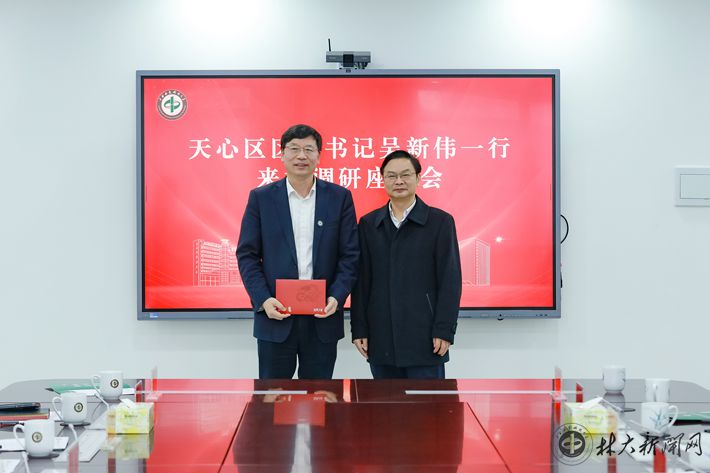【林大网讯】(文/党政办、院士工作办)2月10日上午,天心区委书记吴新伟、区长周志军一行来校拜访中国工程院院士、学校党委书记吴义强,双方在崇德楼1011会议室进行座谈交流。天心区领导许波、张建,学校党委副书记、校长仇怡,副校长尹双凤出席。