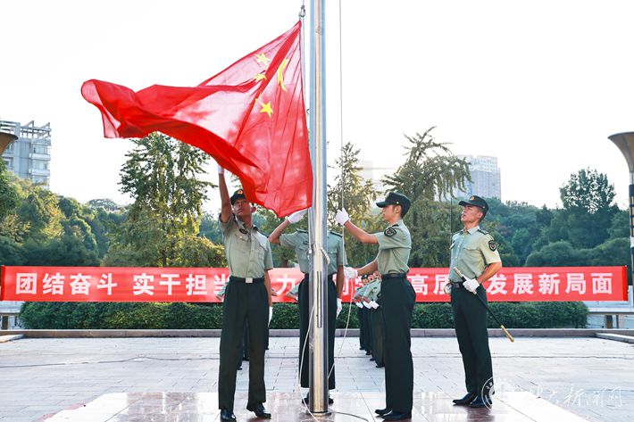 “五星红旗迎风飘扬,胜利歌声多么嘹亮……”迎着鲜艳的五星红旗,千余名师生深情合唱《歌唱祖国》,表达对祖国的赤诚与热爱,展现与祖国共奋进、共成长,为实现中华民族伟大复兴的中国梦而努力奋斗的决心和信心。(一审/李佳 二审/廖乐平 三审/周预分)