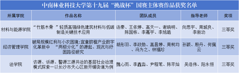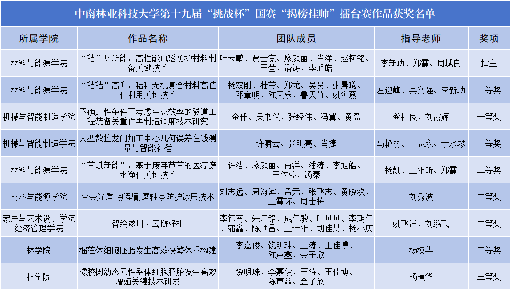 【林大网讯】(文/校团委)近日,第十九届“挑战杯”全国大学生课外学术科技作品竞赛在南京落下帷幕,我校共获国家级奖项12项,其中主体赛三等奖3项,“揭榜挂帅”擂台赛获擂主1项(特等奖第一名)、一等奖3项、二等奖3项、三等奖2项。我校在“揭榜挂帅”擂台赛上首次获得“擂主”,本届赛事在获奖质量、数量上均取得历史性突破。