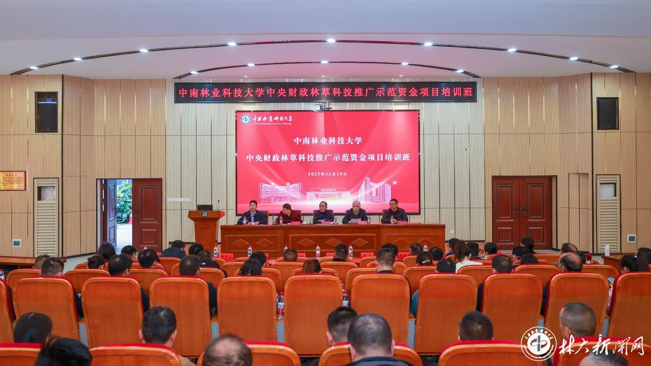 【林大网讯】(文/科学研究部)11月19日,中央财政林草科技推广示范资金项目培训班开班仪式在我校林学院报告厅举行。湖南省林业局科技合作处处长黄向东、二级调研员陈佳辉,学校副校长闫文德出席开班仪式。来自全省14个市(州)及县(市、区)的林业局、科技推广机构、项目协作单位负责人共110余人参加培训。开班仪式由科学研究部部长卿彦主持。