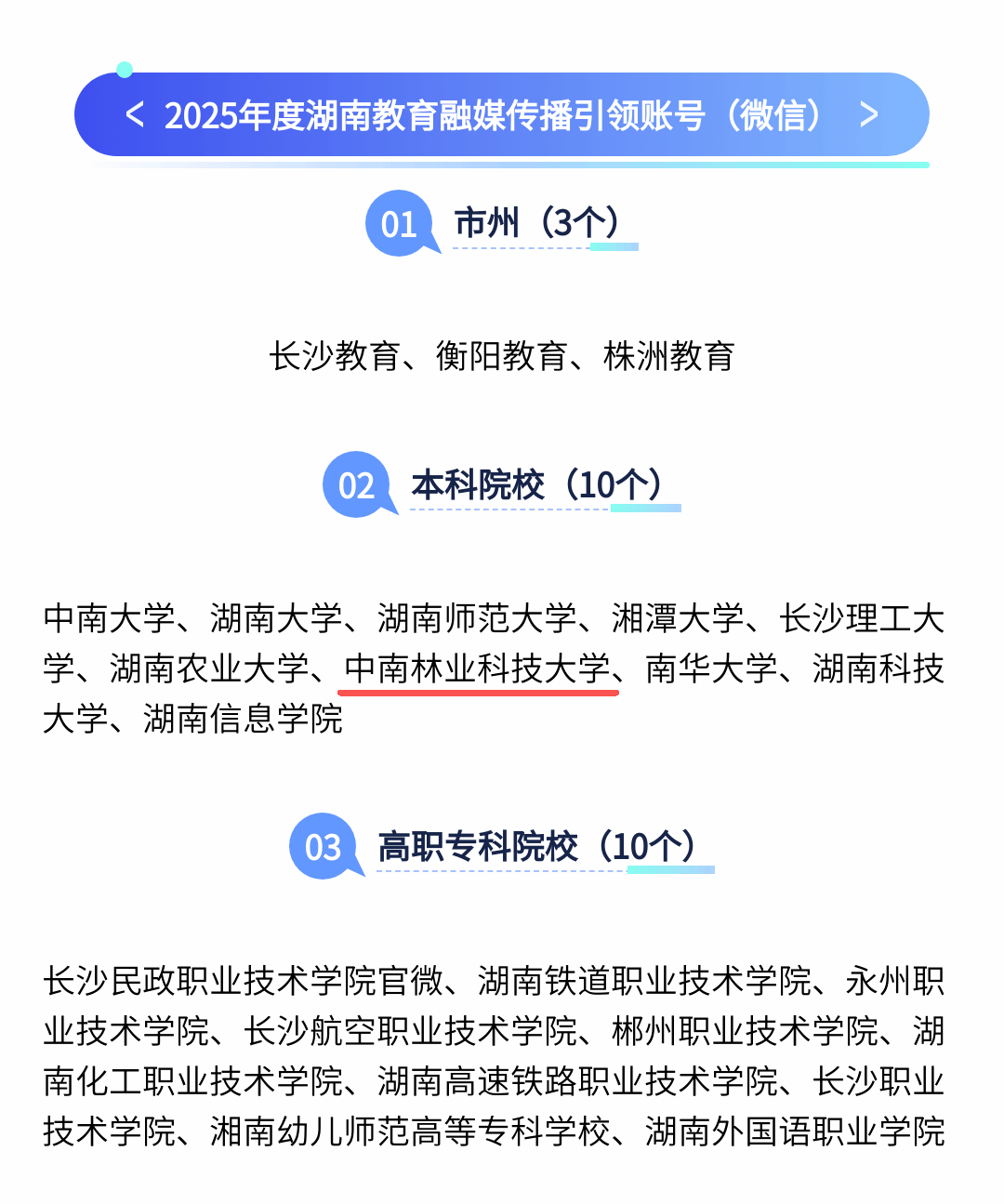 会议现场,公布了2025年湖南教育融媒传播引领账号(微信)名单,我校官方微信公众号入选“2025年度湖南教育融媒传播引领账号”,学校成为此次入选的10所本科院校之一。