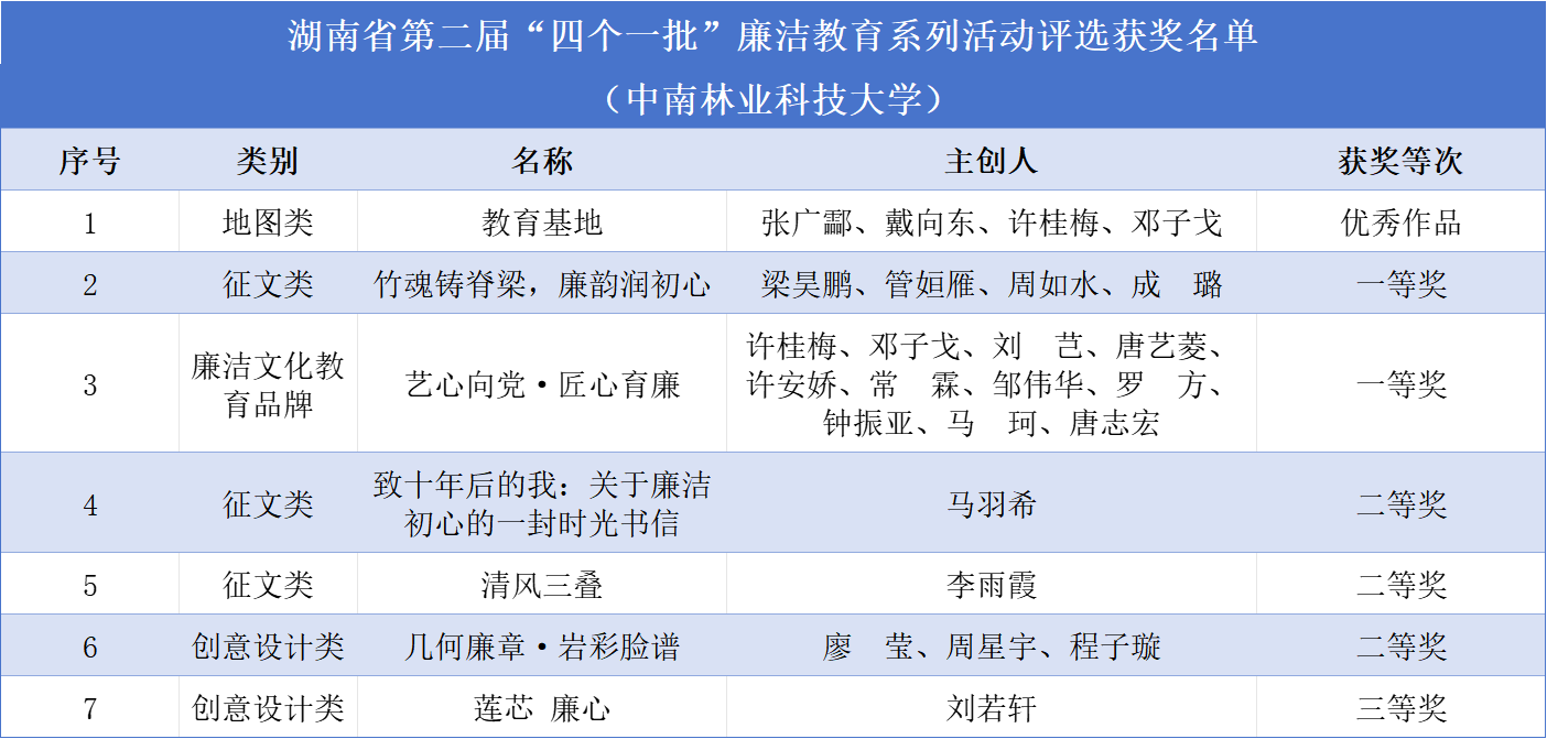 【林大网讯】(文/宣传统战部)近日,湖南省教育厅公布了第二届“四个一批”廉洁教育系列活动评选结果,我校获评一等奖2项、二等奖3项,三等奖1项,优秀作品1项。