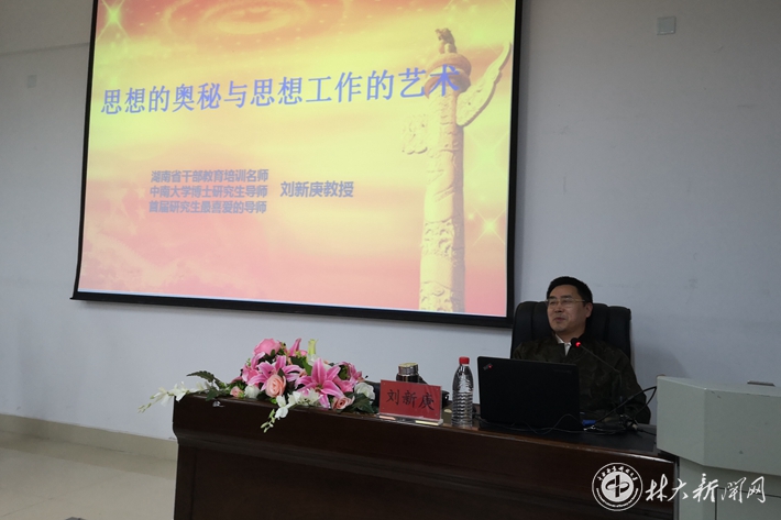 【林大网讯】(文/商学院 陈敬高) 5月20日下午,中南大学马克思主义学院博士生导师刘新庚教授在博文楼南1205报告厅作了一场《思想的奥秘与思想工作的艺术》的主题讲座,商学院全体教职工党员和班主任聆听了讲座,讲座由商学院党委书记陈文俊主持。