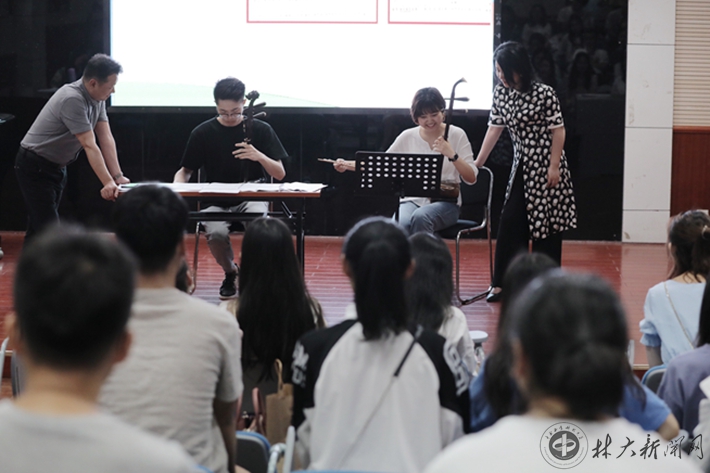 【林大网讯】(文/音乐学院 钟楚鲲)5月29日下午,“湘音弦韵,大筒馨声”大筒进校园教学专题讲座在音乐学院多媒体教室举行。国家一级演奏员、湖南艺术职业学院音乐系副主任蔡霞携手国家一级演奏员、湖南省戏曲音乐协会副会长王勇、中国戏曲表演艺术最高奖“梅花奖”得主叶红,呈现了湖南地方乐器大筒的魅力。