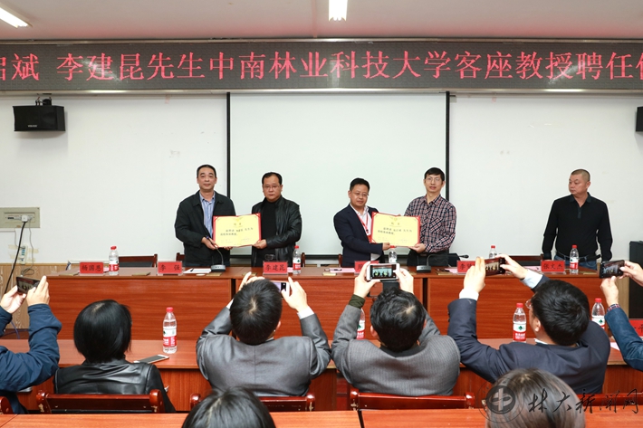 材料科学与工程学院党委书记李强、李贤军分别为周启斌、李建昆颁发了中南林业科技大学客座教授聘书。