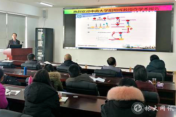 【林大网讯】(文/理学院)1月8日,中南大学化学化工学院教授阳明辉在电子信息楼学术报告厅做了题为“基于磷酸根信号放大的电化学传感器研究”的学术讲座。理学院院领导、化学教研室老师、化学工程与技术学科研究生参加了报告会。报告会由理学院副院长王文磊主持。
