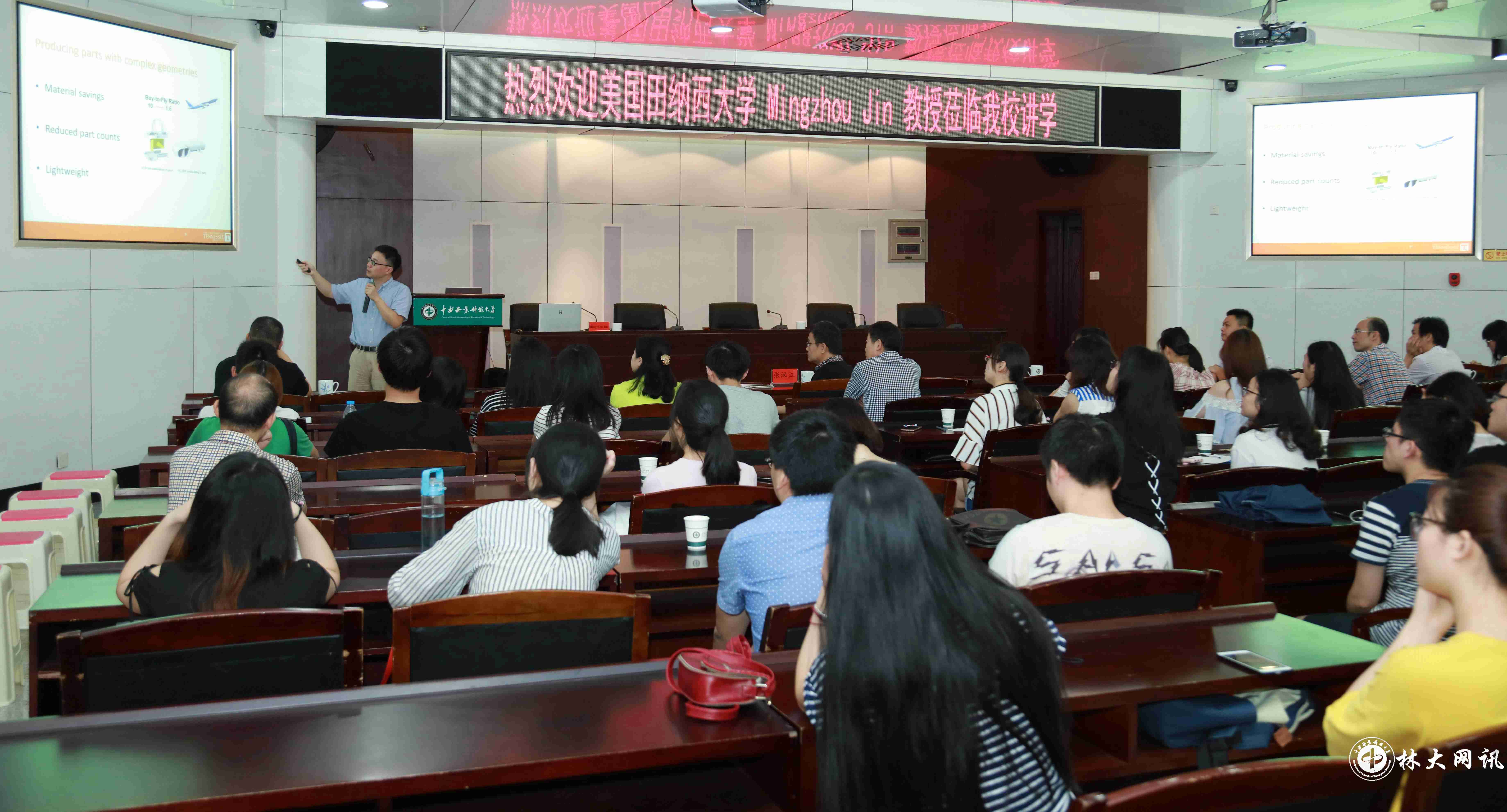 【林大网讯】(文/物流学院 姜晓华)2017年7月3日,美国田纳西大学Mingzhou Jin教授应邀在我校行政楼四楼四会议室作了题为“Smart Logistics Transformation with Additive Manufacturing(增材制造下的智慧物流变革)”的学术报告。副校长王忠伟代表学校给Mingzhou Jin教授颁发“客座教授”聘书。Mingzhou Jin教授表示,将进一步加强与我校物流学科的交流合作,并为物流学科发展贡献力量。此次报告会,共有来自湖南省系统工程与管理学会、湖南大学、中南大学、湖南工业大学,以及我校物流学科的校内外120余名师生参加。
