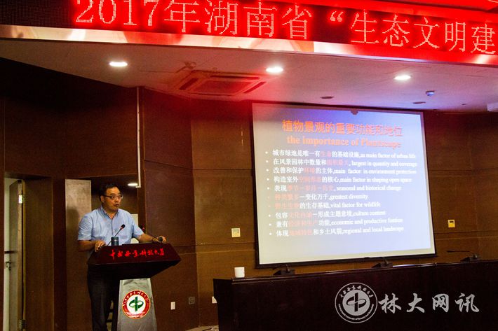 【林大网讯】 7月13日下午,浙江农林大学风景园林与建筑学院包志毅教授在文科楼报告厅为2017年湖南省“生态文明建设与风景园林”研究生暑期学校的学员们作了题为“师法自然,设计和营造植物景观——让城镇充满大自然的生机”的主题学术报告。