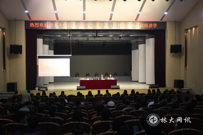 柯林斯在我校作了题为“披头士乐队与马戏团”的专题讲座,音乐学院师生到场聆听。讲座中,他介绍了英国的音乐文化,班戈大学音乐学院的专业、师资、招生等情况,并对班戈学院开学典礼上表演的文艺节目给予高度评价,耐心解答了师生的提问。