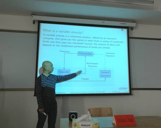 【林大网讯】3月14日下午,美国康涅狄格大学精算学专业Emiliano A. Valdez教授在经济学院1306报告厅为师生做了题为“Regression modeling for the valuation of large variable annuity portfolios”的学术讲座。讲座由经济学院院长朱玉林教授主持,康涅狄格大学GuojunGan博士、湖南大学保险系副主任张宁博士陪同出席。