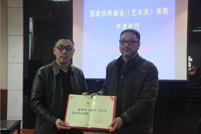讲座开始前,音乐学院院长李祖胜为李敬民颁发聘书,聘请他为客座教授。李敬民教授根据自己多年申报和评审社科课题的丰富经验,就国家社科基金(艺术类)课题的申报技巧进行了细致分析,他指出,申请书的撰写应在需要性、科学性、创新性和可行性原则的指导下进行,课题论证应遵循研究领域切入—研究方向展开—围绕研究目标进行归纳分析—提出研究设想的逻辑思路展开。