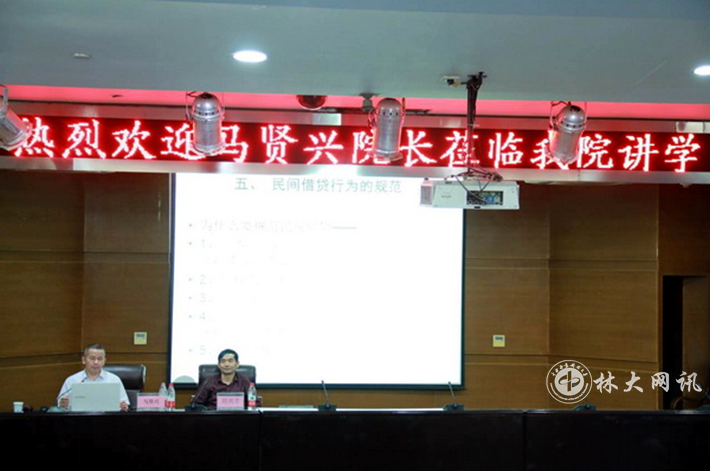 【林大网讯】 5月31日,政法学院邀请长沙市天心区人民法院党组书记、院长马贤兴在图书馆报告厅以《虚假诉讼的防治与民间借贷的规范》为题为我校法学专业师生做了学术讲座。讲座由政法学院院长周训芳主持。学校社会科学处处长蒋兰香、法学专业负责人雷鑫以及法学专业100多位师生参加。