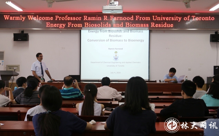授聘仪式后,Farnood作题为“Energy from Biosolids and Biomass Residual: Conversion of Biomass to Bioenergy”学术报告,并对加拿大多伦多大学历史人文、招生政策、科研成果进行简要介绍。他结合其正在从事的生物质资源利用与能源转化研究领域,介绍其带领的团队在生物能源气化、催化剂合成与优化、废弃物回收等方面的研究成果,同时也就北美地区在生物质资源材料化与能源化利用方面的研究进展开展深入讨论。