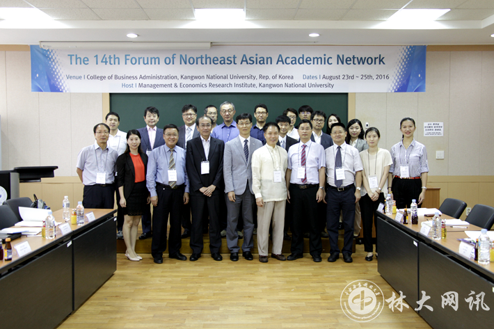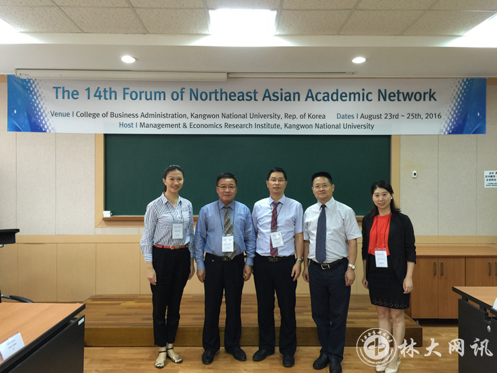 【林大网讯】 应韩国江原大学经营学院的邀请,我校经济学院朱玉林教授、谭丹副教授、李晓敏副教授和商学院尹少华教授、陈文俊教授等5人组成的学术交流团于2016年8月23日-27日间赴韩参加2016年第十四届东北亚国际学术会议。东北亚学术会议是由日本富山大学发起,中南林业科技大学、日本富山大学及韩国江原大学共同举办的一个亚太地区国际学术交流平台,每年举办一次。第十四届东北亚国际学术会议主题为:“拓交流,谋合作”。