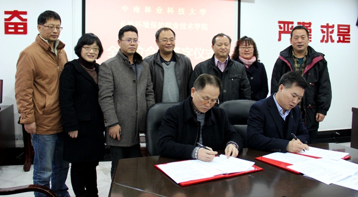 2015年12月24日,我校副校长赵运林教授与环境科学与工程学院班子、老师一行6人来到长沙环境保护职业技术学院进行交流访问。长沙环保职院吕文明校长对我校来访人员表达了诚挚的欢迎,并介绍了长沙环保学院近年办学情况,我校赵运林副校长对于两校合作提出了“同生、共长、共繁荣”的期待。通过参观、学习,交流,双方签订了《中南林业科技大学与长沙环境保护职业技术学院全方位合作框架协议》、《中南林业科技大学与长沙环境保护职业技术学院建立本科生、研究生实习与创新基地合作协议书》。 (文/环境科学与工程学院 编辑/黄礼云)