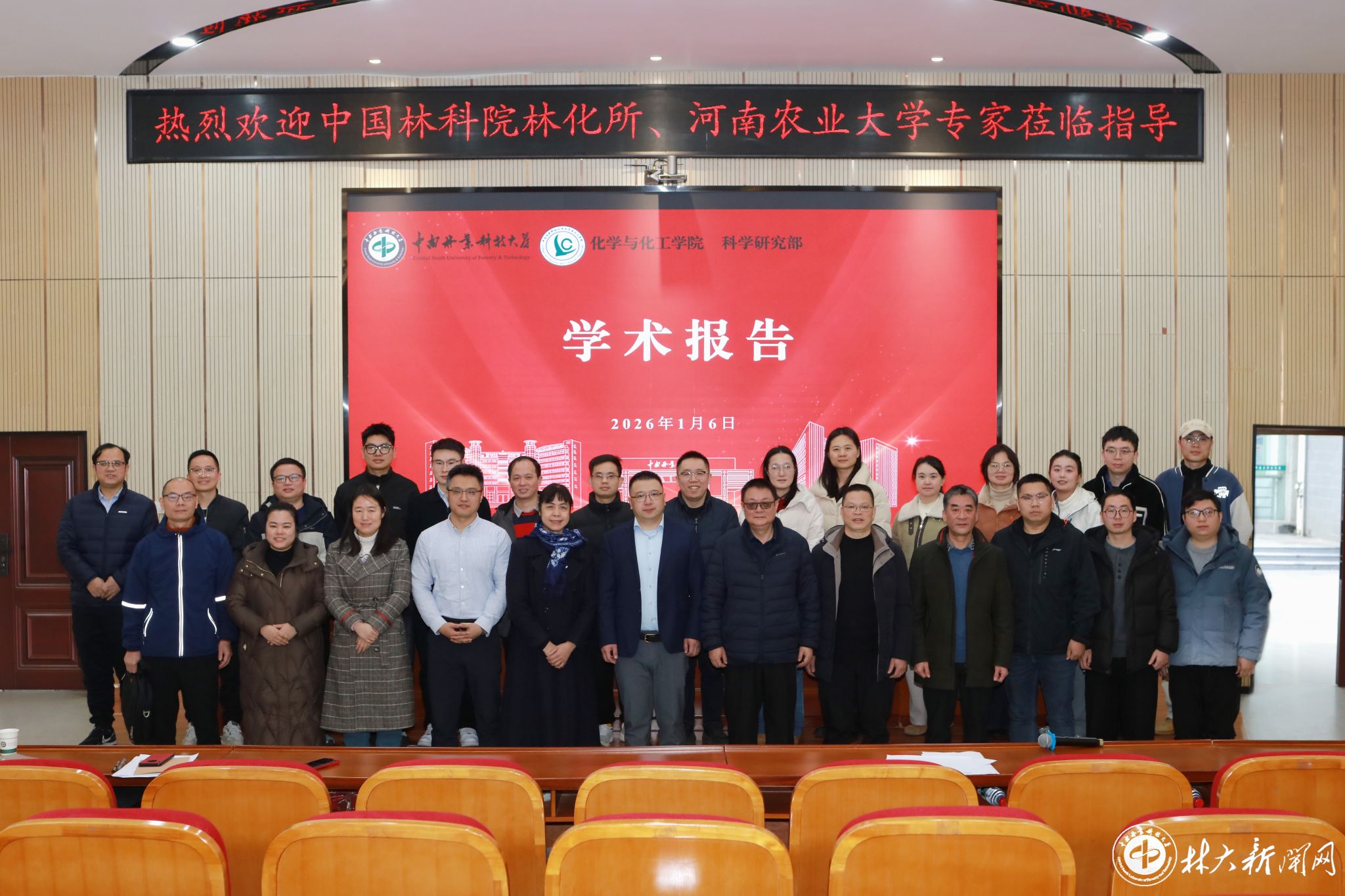 【林大网讯】(文/化学与化工学院)1月6日,中国林业科学研究院林产化学工业研究所刘鹤、王奎研究员应邀来校开展学术交流并作主旨报告。河南农业大学刘艳艳教授,学校科学研究部、化学与化工学院负责人,师生代表共200余人参加报告会。科学研究部部长卿彦教授主持报告会。