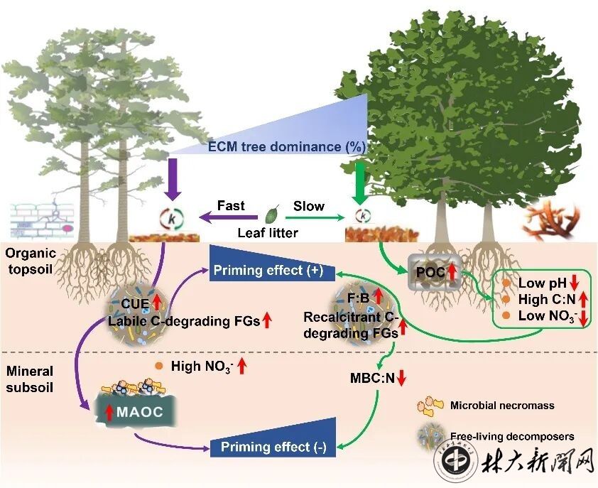 森林土壤储存着一半以上陆地土壤有机碳,新鲜有机物进入土壤引发的“激发效应”,直接决定土壤固碳或释碳。研究团队聚焦树木菌根类型这一关键因子,利用天然菌根梯度样地,对表层(0-10cm)和深层(10-30cm)土壤开展研究。研究发现,表层土壤中新鲜碳输入引发正激发效应,随ECM树木占比升高而减弱;深层土壤则出现反转,呈现负激发效应(保护原有碳),且AM主导森林负激发效应更强。团队从碳存在形式、氮分配策略、微生物分工三个方面揭示了内在机制。该成果为森林碳汇潜力预测提供新依据,纠正了仅研究表层土壤的认知误区,明确评估碳汇需兼顾菌根类型与土壤深度。