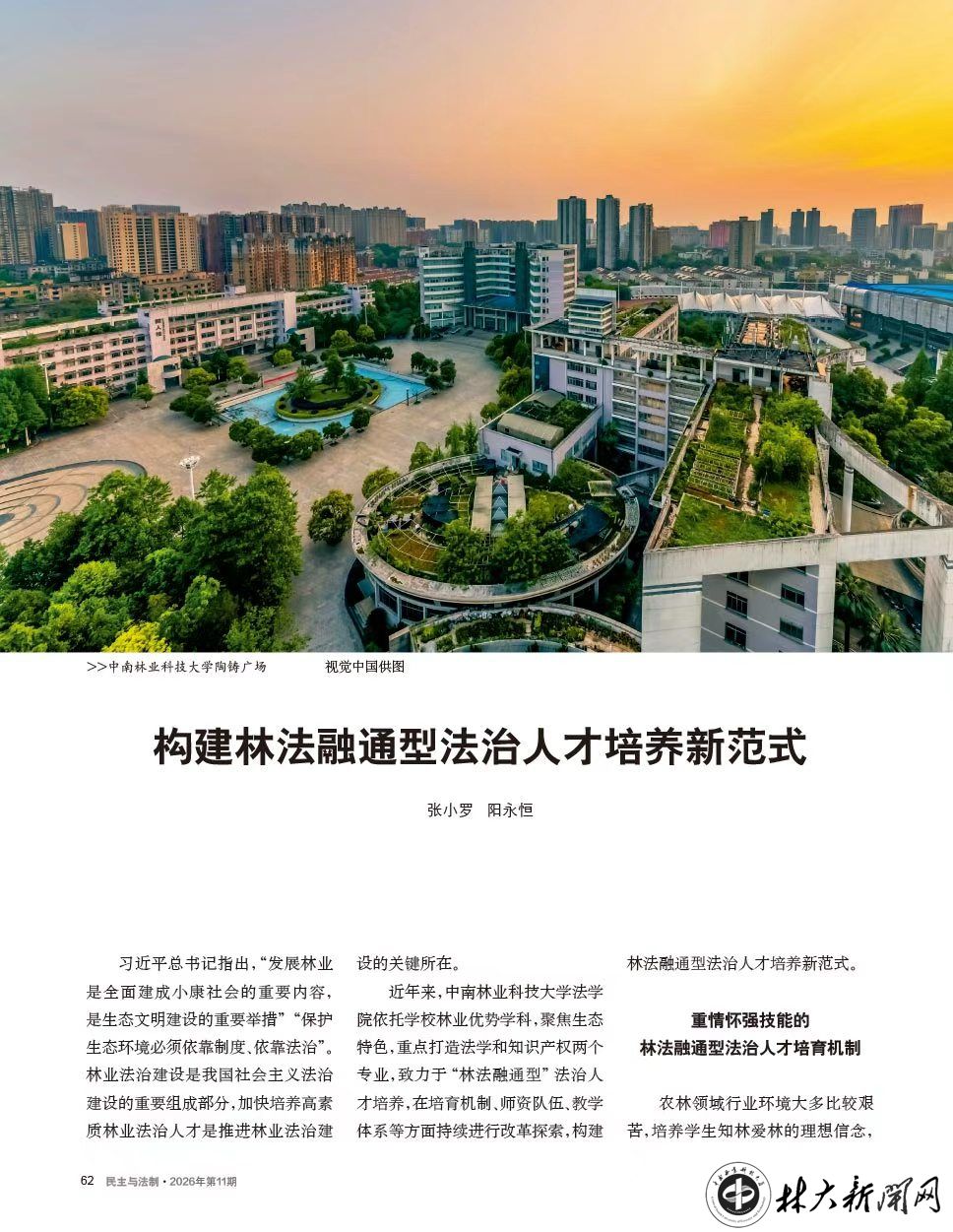 【林大网讯】(文/法学院)近日,我校法学院张小罗教授、阳永恒副教授在中国法学核心科研评价来源期刊(CLSCI)《民主与法制》2026年第11期发表《构建林法融通型法治人才新范式》一文。