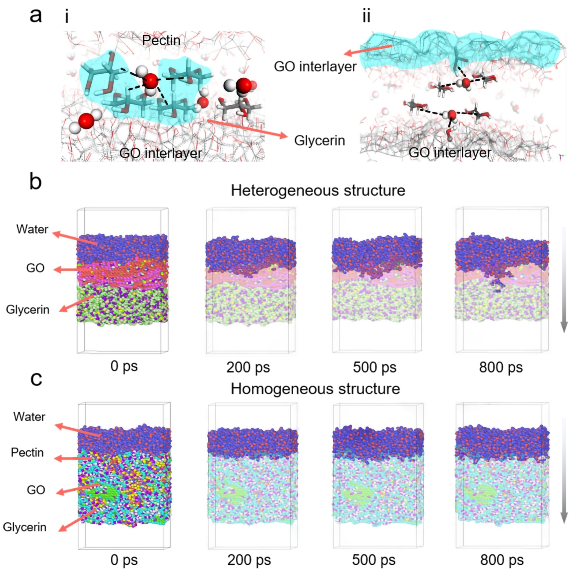 针对上述瓶颈问题,研究通过非均相结构界面调控策略,在生物质材料果胶涂层与基体之间引入甘油分子,构建了具有空间梯度分布特征的非均相不对称界面结构。该界面能够自发建立稳定的水分化学势梯度,突破传统渗透压驱动机制,构建出一种全新的“不对称水分响应”模式。得益于界面非均相结构与传输路径的重构,所制备的果胶基涂层在宽相对湿度范围(30%-90%)内均展现出优异的水分响应性能与高效的湿气捕获能力,显著优于传统均相体系。