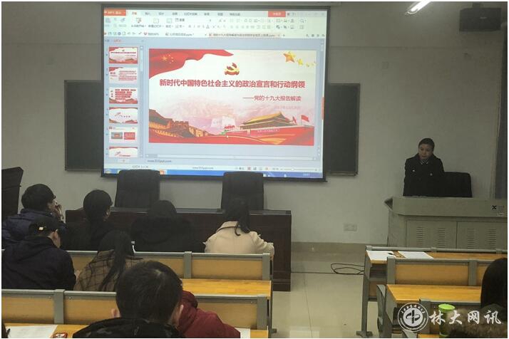 【林大网讯】(文/政法学院 曾晓峰)12月26日晚,政法学院党委邀请张家界市公安局禁毒支队副支队长、中央政法委、教育部“双千计划”互聘人员卓曼丽同志为学生党员作党的十九大精神辅导报告。卓曼丽同志以“新时代中国特色社会主义的政治宣言和行动纲领”为主题,与学生党员分享自己学习党的十九大报告的学习体会。