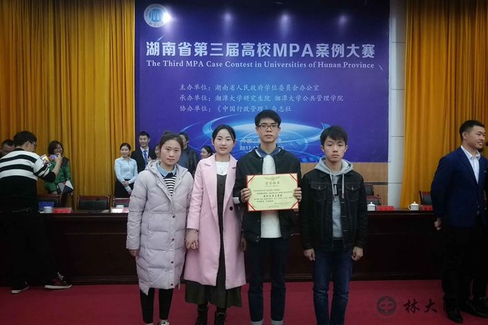 【林大网讯】(文/政法学院 熊玲君)12月3日,由湖南省人民政府学位委员会主办,湘潭大学承办,《中国行政管理》杂志社协办的湖南省第三届高校MPA案例大赛在湘潭大学落幕。全省共有13所高校的55支队伍参赛,分为本科生组和研究生组,设一等奖2项,二等奖4项,三等奖6项。我校政法学院2016级行政管理本科生李祎炅、童梦园、李泽龙、曹宇四位同学组队,在曹芳、匡娉婷老师的指导下撰写的《信用租房:无“信”不立时代租房模式的新变革》荣获本科生组三等奖。