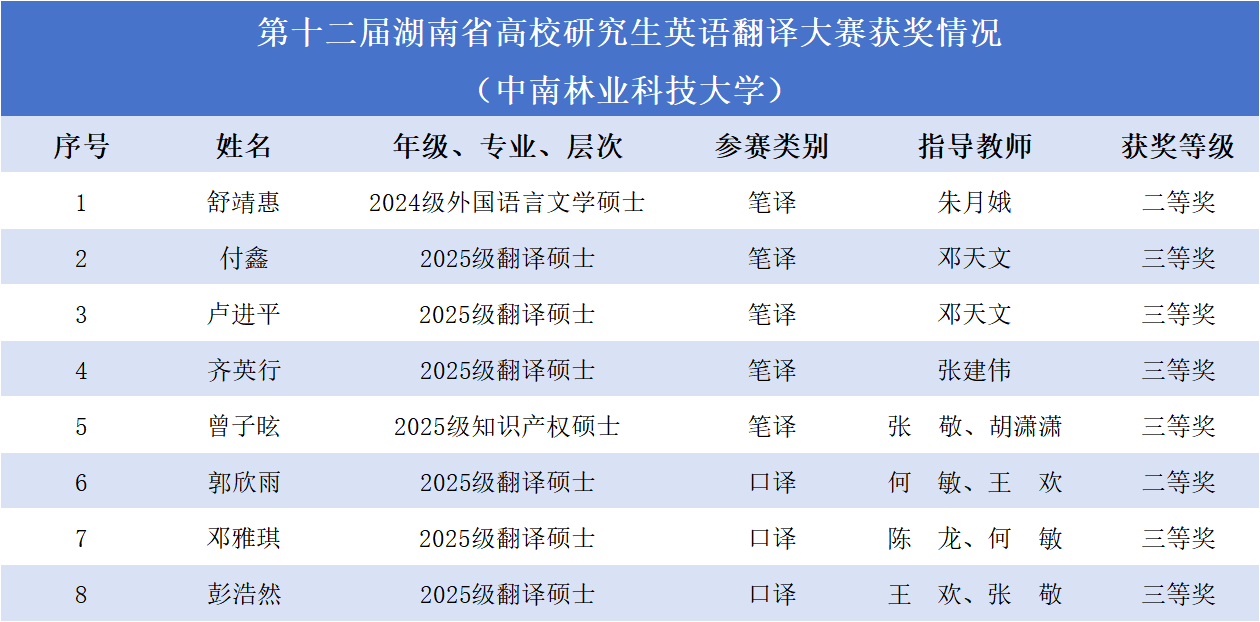 【林大网讯】(文/外国语学院)11月22日,第十二届湖南省高校研究生英语翻译大赛在中南大学落下帷幕,我校代表队荣获个人二等奖2项、三等奖6项,学校荣获优秀组织奖。