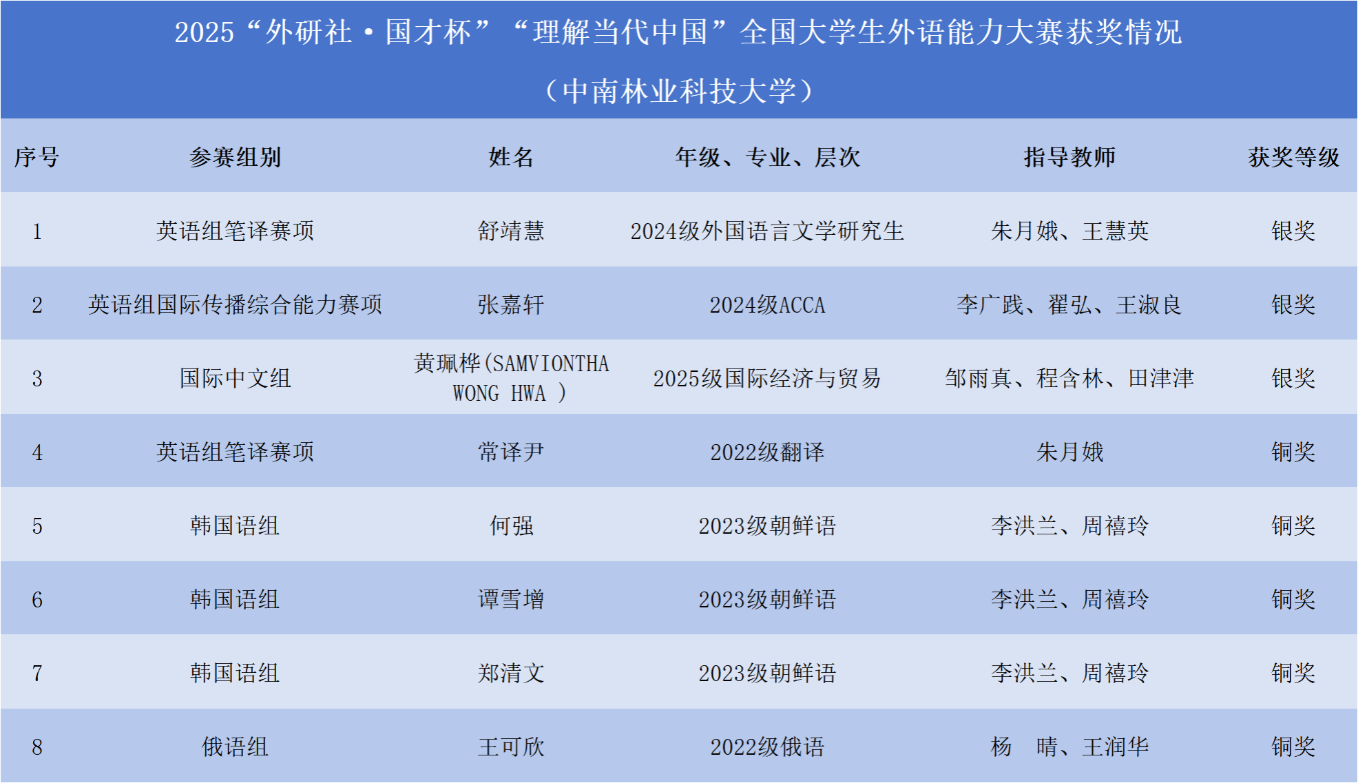 【林大网讯】(文/外国语学院)12月8日,“外研社·国才杯”“理解当代中国”全国大学生外语能力大赛圆满落幕。经过激烈角逐,我校学子凭借扎实的专业素养和出色的综合能力,在全国1537所院校的72.6万参赛选手中脱颖而出,斩获银奖3项、铜奖5项。