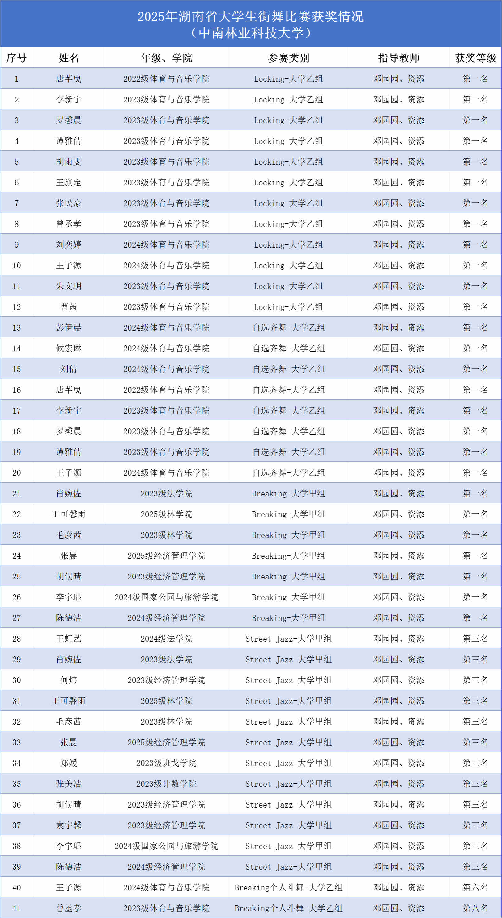 【林大网讯】(文/体育与音乐学院)12月7日—8日,由湖南省教育厅主办的首届湖南省大学生街舞比赛在湖南工程职业技术学院体育馆圆满收官。学校街舞队在邓园园、资添老师的带领和悉心指导下出战,队员们首次组队参赛即表现优异,在Locking(锁舞)、Breaking(霹雳舞)和自选齐舞项目中勇夺冠军,取得团体总分第二名的成绩。