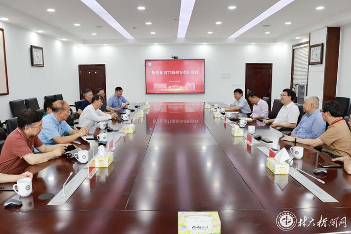 吴义强代表学校对此次回访母校的黄喜佳、谭天泳、彭长清、孙明、谭一凡、方丹阳、叶俊超、谌小勇等校友表示热烈欢迎。他指出,77级林学专业校友是国家恢复高考之后我校招收的首届大学生,毕业后在各自岗位都做出了很好成绩,为学校赢得了社会声誉,他对校友们持续关心和支持母校发展表示衷心感谢。他和校友们一起重温了学校在溆浦大江口艰苦卓越的办学历程,表示将秉承老一辈中南林人艰苦奋斗、勤俭办学、勇攀高峰的精神,在广大校友的关心支持下,团结带领全校师生员工,奋力谱写学校高质量发展新篇章。