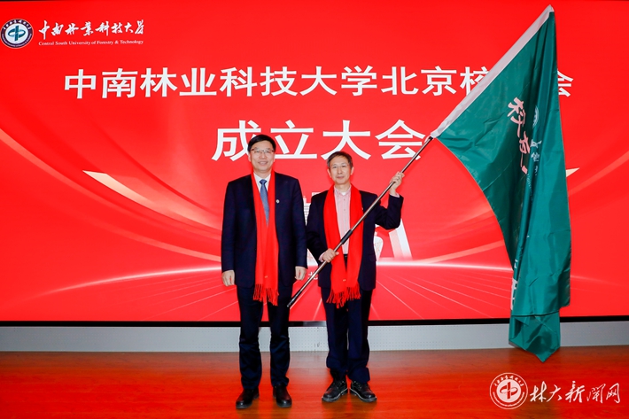 ▲中国工程院院士、学校党委书记吴义强为北京校友会授会旗