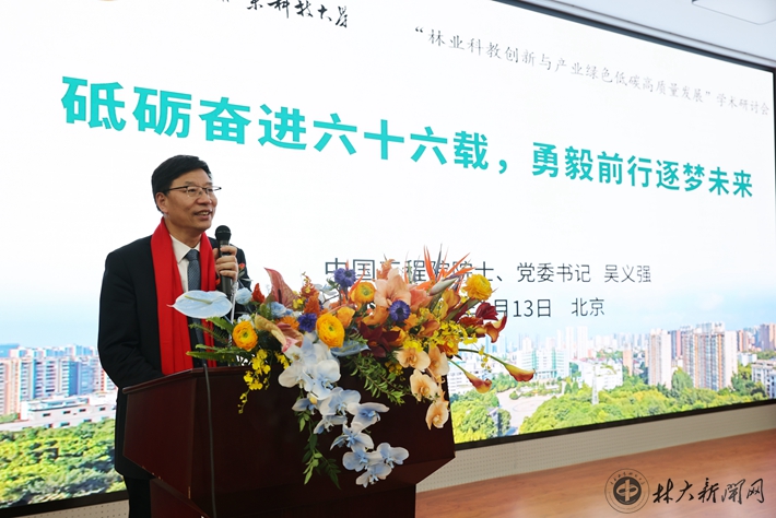 【林大网讯】(文/校友办)砥砺奋进六十六载,勇毅前行逐梦未来。为有效整合北京校友资源,推动“校友回湘”工作落实落地,1月13日下午,中国工程院院士、学校党委书记吴义强率队赴北京参加北京校友会成立大会和“林业科教创新与产业绿色低碳高质量发展”学术研讨会,推进“校友回湘”工作并组织校友座谈交流。学校党委副书记仇怡,纪委书记杨鑫铨,副校长王忠伟、尹健、闫文德、尹双凤出席,省教育厅“校友回湘”工作专班执行主任周韶峰受邀作湖南省推进“校友回湘”政策宣讲。在京及来自全国各地的校友代表共150余人参加活动。