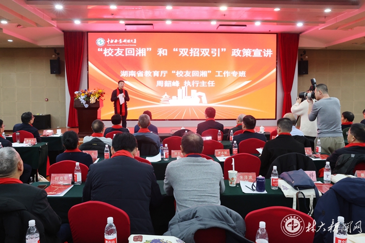 期间,周韶峰应邀作了湖南省推进“校友回湘”工作政策宣讲。他简要介绍了省委省政府推进“校友回湘”工作的背景和重要意义,推介了“校友+人才”返湘、“校友+科技”兴湘、“校友+项目”聚湘、“校友+企业”来湘、“校友+教育”强湘五大工作举措。他鼓励校友们积极响应省委、省政府号召,以“校友圈”串起人才链、创新链、产业链、服务链和教育链,互利共赢、相互成就,助力湖南和母校高质量发展。