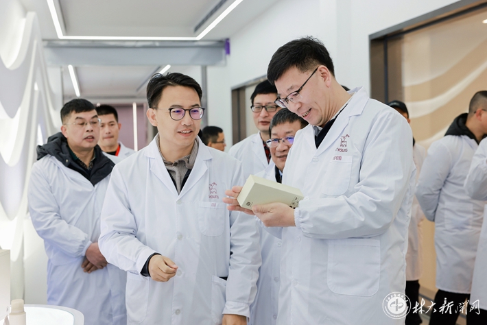 ▲中国工程院院士、学校党委书记吴义强一行参观水羊化妆品智能制造示范工厂与研发中心