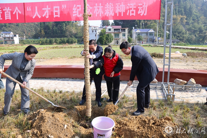 活动结束后,参会领导、嘉宾在甘溪村伯乐林,实地开展种植伯乐树并挂牌认领活动。嘉宾们多人一组,挖坑、放苗、填土、浇水、固苗,齐心协力,干劲十足。