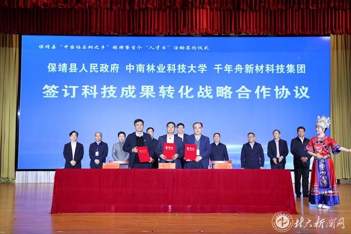 ▲学校与保靖县人民政府、千年舟新材料科技集团股份有限公司签订科技成果转化战略合作协议